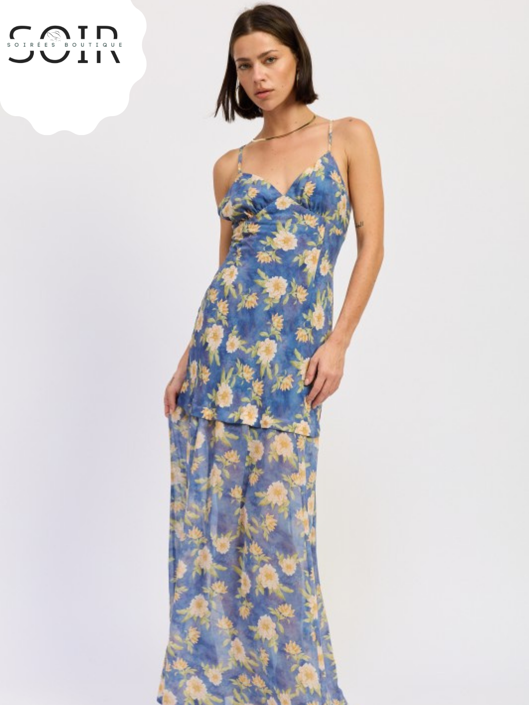 Light, flowing, and endlessly graceful, the Azure Bloom Cross-Tie Maxi Dress is designed to move beautifully with every step. Crafted in a rich blue base scattered with sunny yellow florals, this maxi silhouette feels fresh, feminine, and quietly captivating.