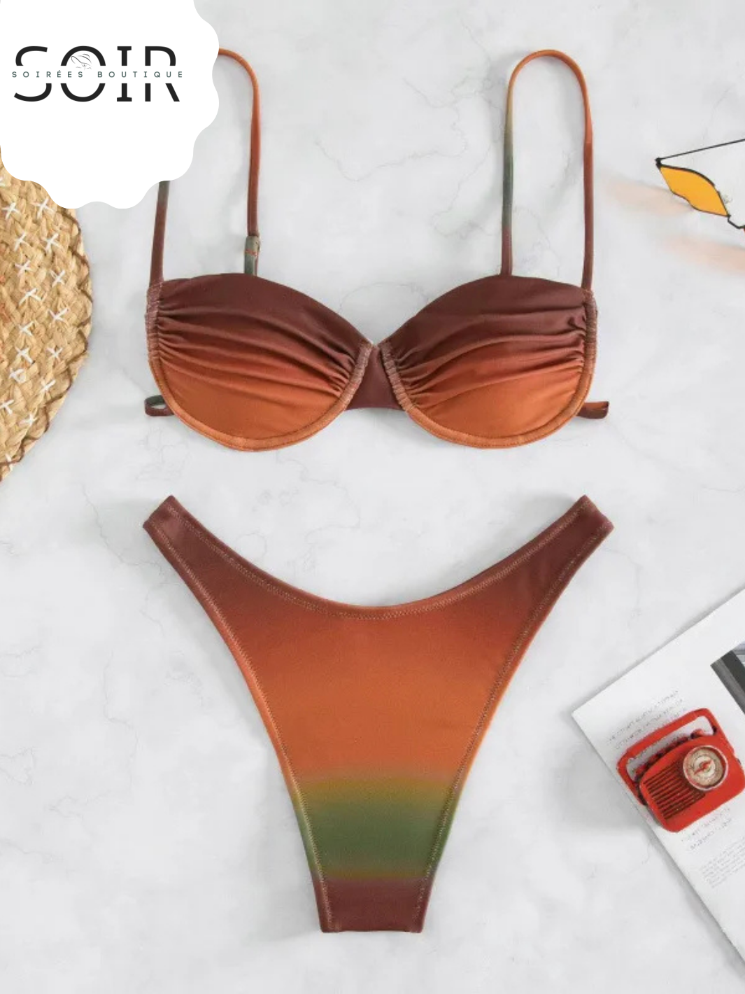 The soft ombre print melts across the fabric like a glowing sunset, creating a smooth color fade that feels playful and eye-catching. The underwire top delivers the perfect balance of lift and support, while the two-piece silhouette keeps things flirty, flattering, and ready for movement—from beach days to poolside parties.